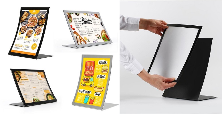 Stijlvolle kaarthouder, enigszins lichtgebogen. Gemaakt van gepoedercoat staal. Werkt met magneetfolie waar men een print achter steekt. Uitvoering in grijs of zwart, staand of liggend A4.| Aantal | Prijs per stuk |